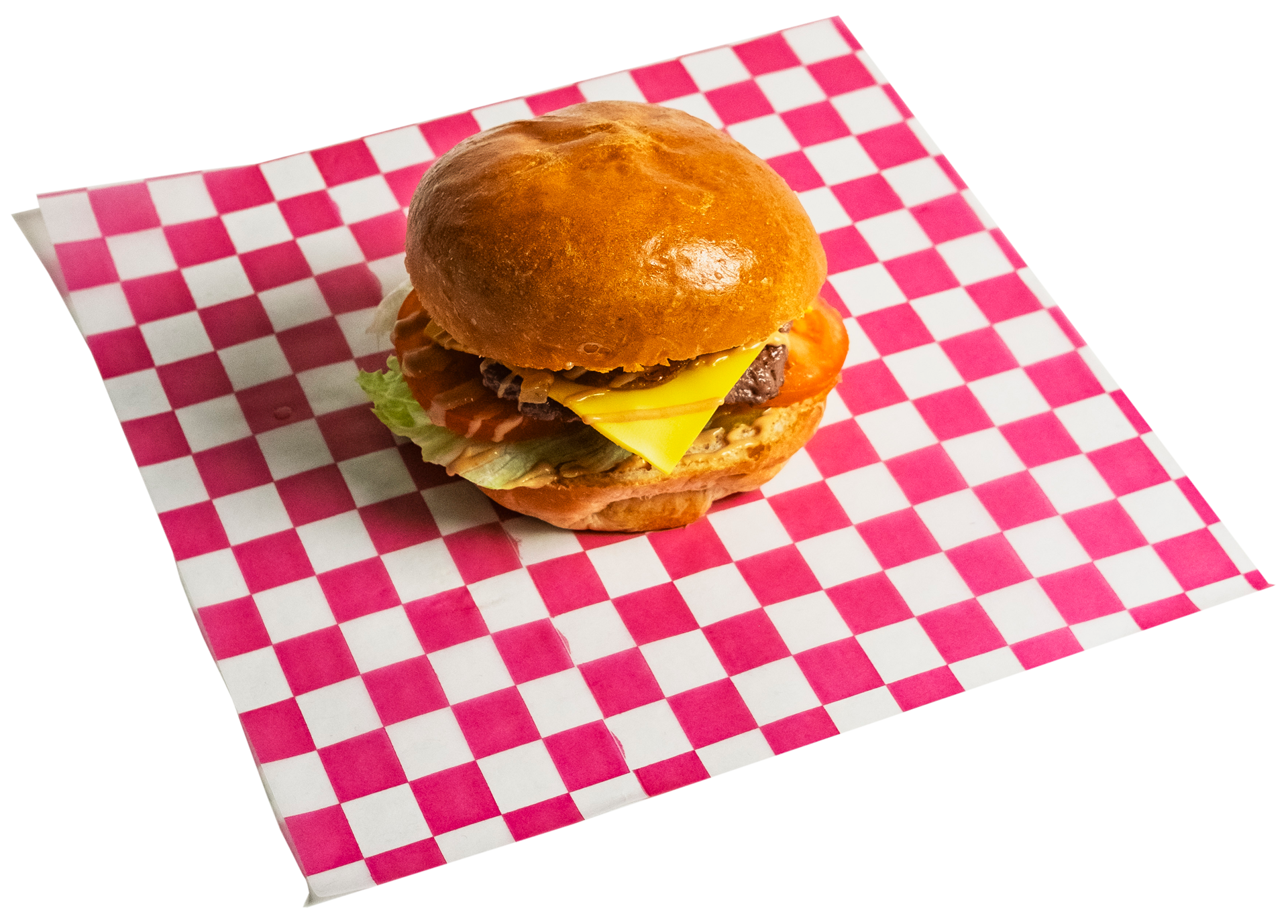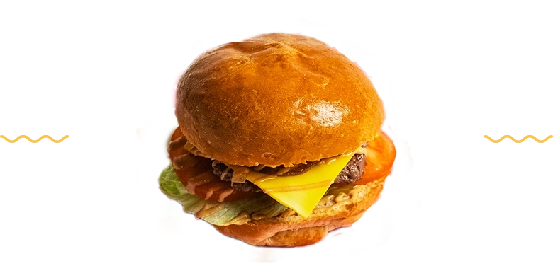 Pan brioche con carne smash, cebolla caramelizada, aderezo Ollie, queso, pepinillos, tomate y lechuga.